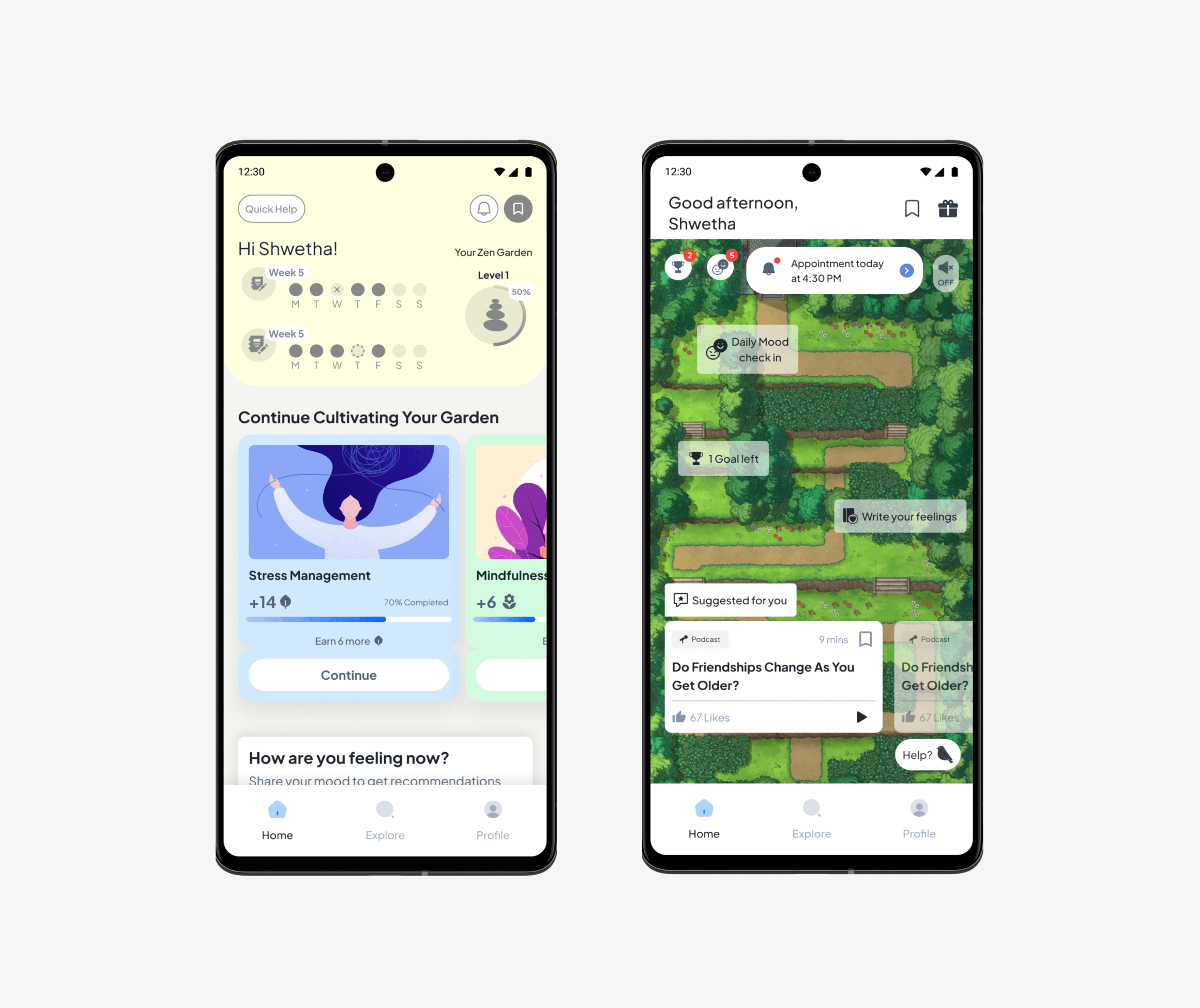 In the course of the project, my research into existing Employee Assistance Programs (EAPs) and emerging mental health technologies played a pivotal role in comprehending user needs and industry best practices. Delving into common pain points associated with workplace stress and analyzing digital tools promoting healthy routines yielded valuable insights. The exploration of habit-building products provided a nuanced understanding of user engagement strategies, encompassing incentive structures, reminders, and progress tracking. These insights influenced core design decisions, placing a strong emphasis on goal-setting flexibility, positive reinforcement messaging, and customizable tracking options. Throughout the process, I developed multiple concepts and evaluated each, scrutinizing their strengths and weaknesses.